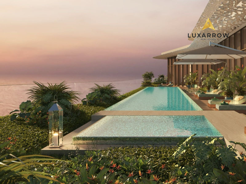 The living spaces overlook a private infinity pool clad in stone slabs with water flowing over its sides, giving the illusion of disappearing into the balcony floor.