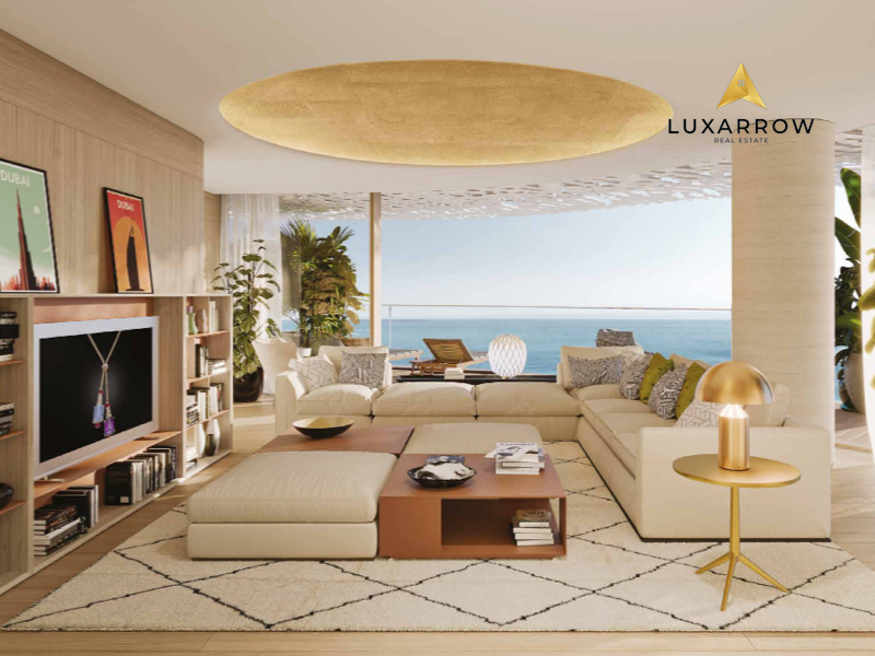 A double-height living room is complemented by an extensive outdoor living area with spectacular views over the Bulgari Resort and beyond to the iconic Dubai skyline.